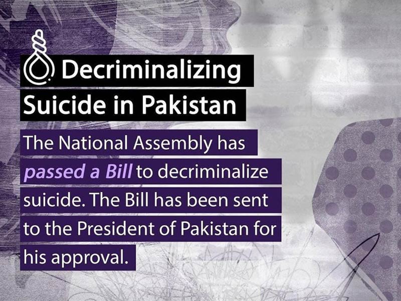 NCHR & Taskeen commend the Parliament on passing the Bill, and acknowledge Senator Awan & Mr. Qadir Khan Mandokhail, who were instrumental in getting the Bill passed.Those who attempt suicide often suffer from mental illness, and criminalization exacerbates their suffering. Decriminalising suicide creates avenues for compassionate treatment of survivors and reduces stigma against them.